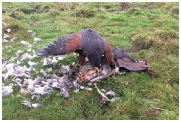 John Cunningham had some great flights with his female Harris and managed to put two rabbits in the bag, boy does she hit them hard not many get away from this bird.